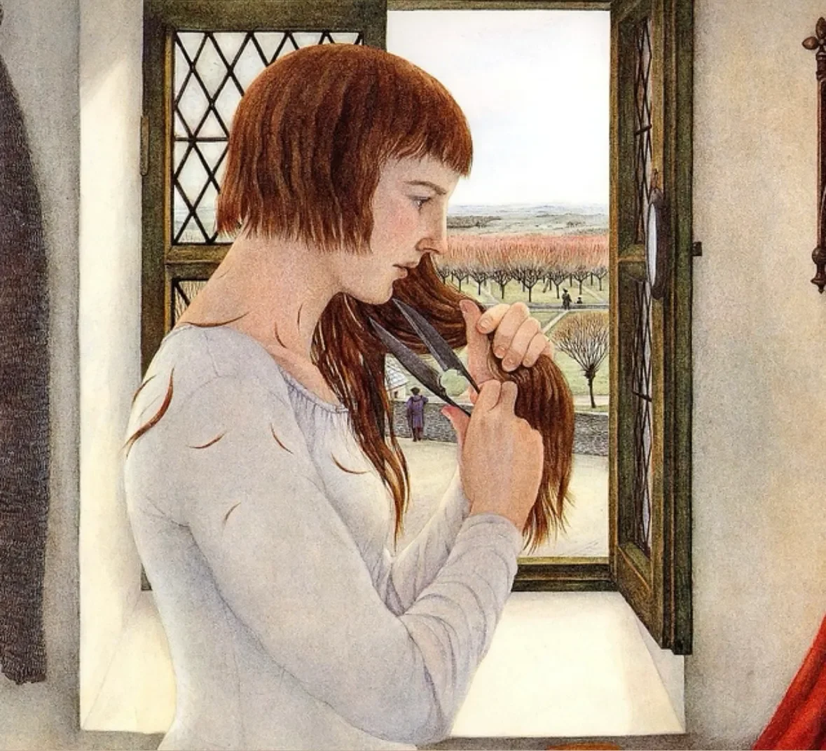 Illustration of Jehanne Cutting Their Hair by Josephine Poole